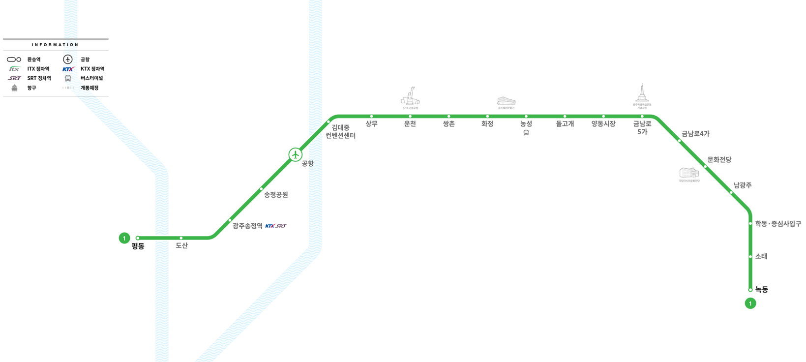 💡 광주 지하철 1호선은 하나의 노선으로 구성되어 있지만, 주요 생활권을 이어주기 떄문에 활용도가 매우 높습니다. 향후 2호선 개통도 예정되어 있습니다.
