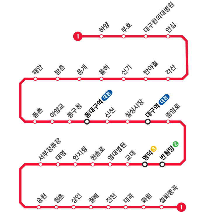 - 설화명곡 - 화원 - 대곡 - 진천 - 월배 - 상인 - 월촌 - 송현 - 서부정류장 - 대명 - 안지랑 - 현충로 - 영대병원 - 교대 - 명덕 - 반월당 - 중앙로 - 대구역 - 칠성시장 - 신천 - 동대구역 - 동구청 - 아양교 - 동촌 - 해안 - 방촌 - 용계 - 율하 - 신기 - 반야월 - 각산 - 안심 - 대구한의대 - 부호 - 하양