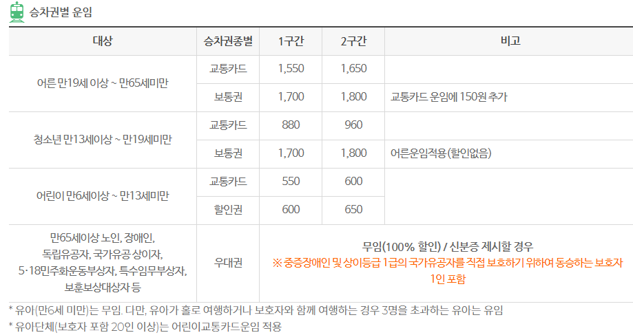 - 만 65세 이상 어르신, 장애인, 국가유공자 등은 관련 자격 조건 충족 시 전 구간 무료 또는 할인 혜택을 받을 수 있습니다.