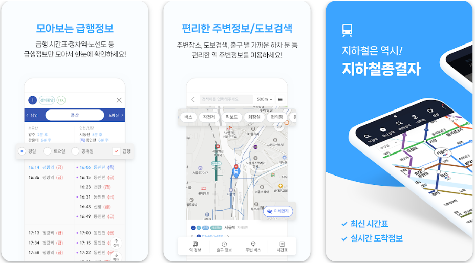 - 지하철종결자 앱: 최적 경로 탐색은 물론, 환승 구간 안내, 실시간 열차 위치 및 도착 예측 기능까지 제공해 뛰어난 편리성을 자랑합니다.