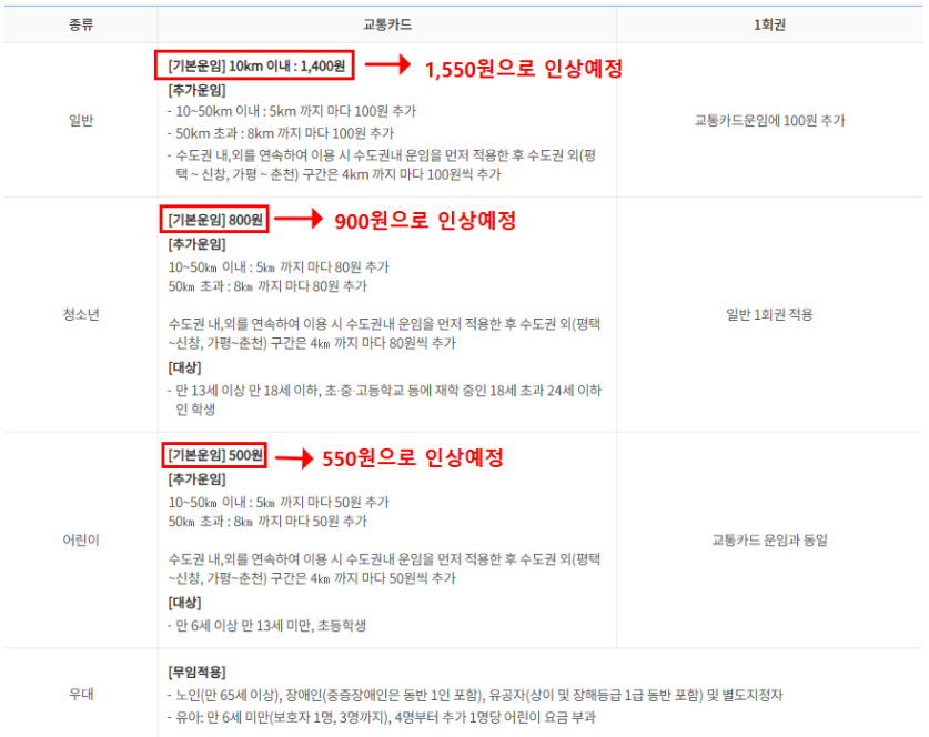 ✅ 교통카드 기본요금 (인상 예정 기준)