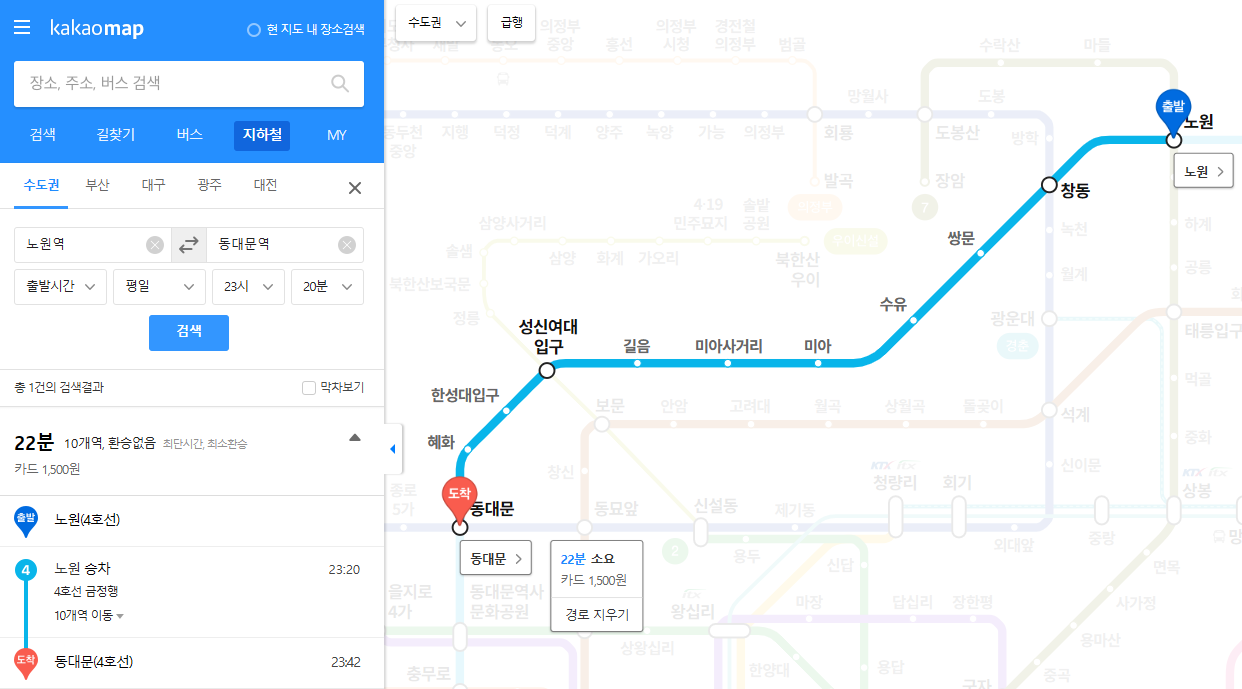 2️⃣ 페이지에 접속한 후 수도권을 선택하고 출발할 역과 도착할 역을 입력합니다.