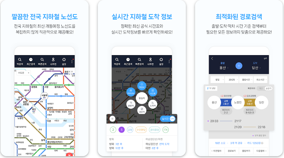 - 네이버 지도나 카카오맵 같은 앱에서도 지하철 도착 정보를 실시간으로 확인할 수 있습니다. 출발역과 도착역을 입력하면 열차 도착 시간뿐 아니라 소요 시간, 환승 경로, 막차 시간까지 안내해 주므로 처음 가는 길에서도 걱정이 없습니다.