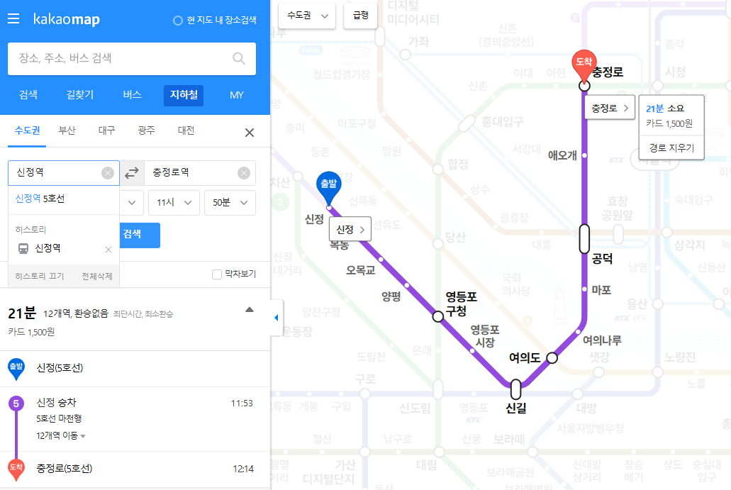 2️⃣ 출발역과 도착역을 입력한 후 검색합니다.