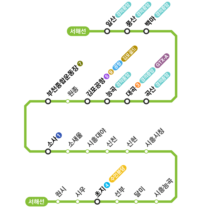- 환승 가능 노선: 1호선(소사), 5호선·9호선·김포골드라인(김포공항), 3호선(대곡), 경의중앙선(일산)