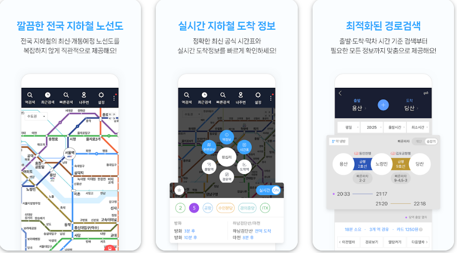 - 지하철종결자 앱: 전체 지하철 노선뿐 아니라 환승 정보, 배차 간격, 출구 위치까지 상세히 제공되어 초행길에도 유용합니다.