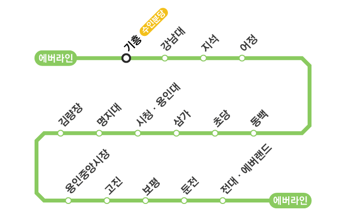 기흥역에서 수도권 수인분당선으로 환승할수 있어, 광역 이동도 원활하게 할수 있고 출퇴근 및 관광객들의 이동을 편리하게 도와주고 있습니다. 노선도 확인방법은 어렵지 않습니다.